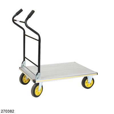 Product Descriptionp/pWesco 24x35.5 Aluminum Folding Ergo-Handle Platform Truck - 270382. Ergonomic European style handle, Lightweight aluminum, 2 rigid, 2 swivel rubber tread casters, Corner bumpers